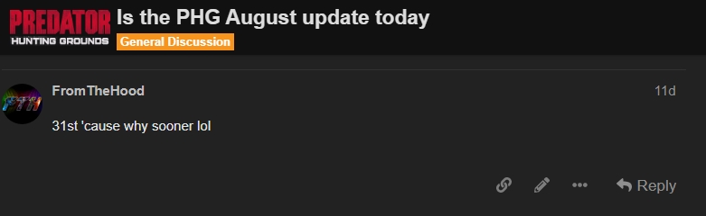 We had two potential dates. The update is the last Tuesday of the month, but because of Fireteam it was believed Illfonic might tie into that given Predator’s Alien connection. That’s why I’d been stating two dates on posts about the update. It was either going to be a tie-in or it was going to be the last Tuesday of the month.