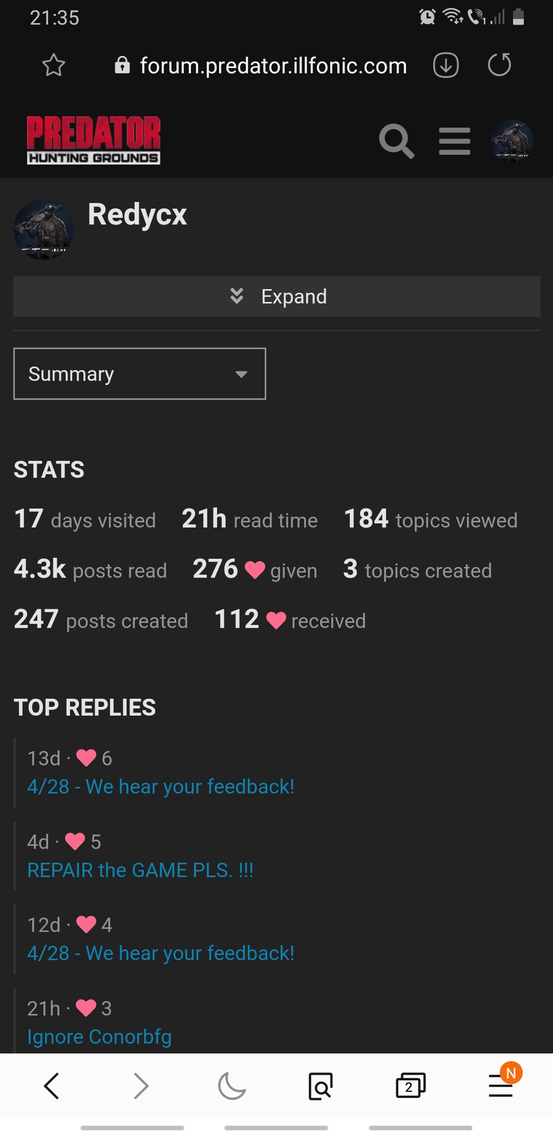That person literally has done nothing in the forum guys. Only one hour of read time?! He might have skimmed something but that definitely ain’t illfonic showing they give a f about any of this. I’ve been playing since day one, hit lvl 100 within 4 days and still haven’t stopped playing. The only reason for that is because I get to play as the mf Predator. I’m sick of them posting fan submissions without a damn word from them in response to ANY of OUR QUESTIONS or CONCERNS. That is bs and no matter how much we enjoy playing the game, that is unacceptable and can NOT be defended.