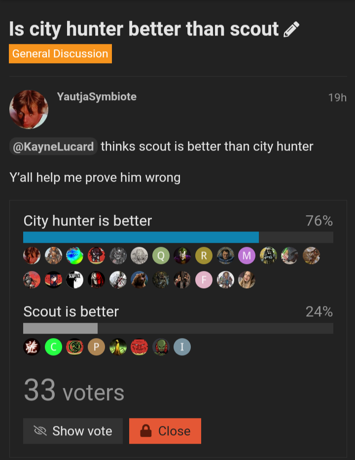 I ain’t fucking running CH he has 10 Perk Points, can’t do shit with that. Base Hunter does better. Cleo & Elder do WAY better. City’s saving grace is that he has Analytic which is slightly superior to Stalker but so does Scout and Scout has the same movement speed with superior Perks & a smaller hitbox.