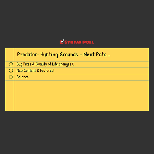 bug fixes and quality of life. damn right. i voted for that. i would of voted balance too. for the sake of preds under powered other weapons. but eh. QOL and bug fixes come FIRST or at least they should be a priority too!