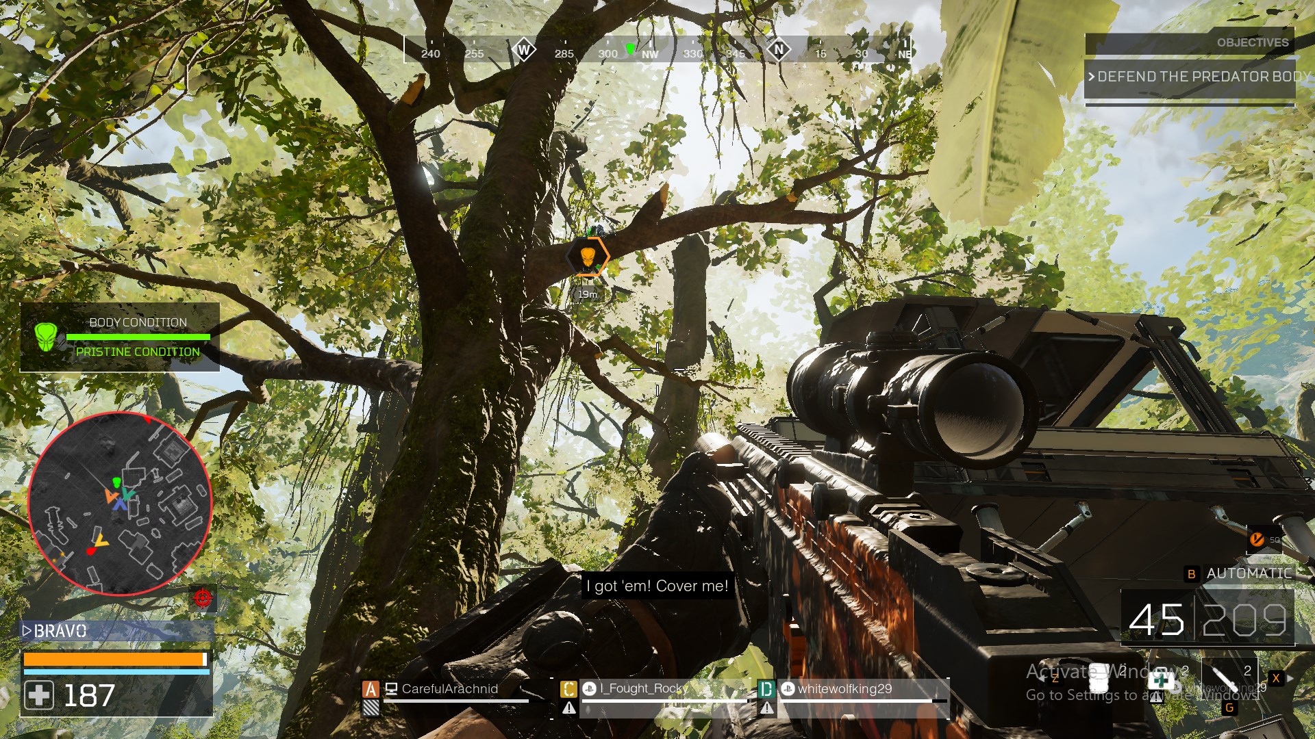 perfect screenshot of a glitch hes supposed to fall down when he is shot death in a tree bud he wont be safe up there ai still lucking around to put a bullet in his body so protection is needed