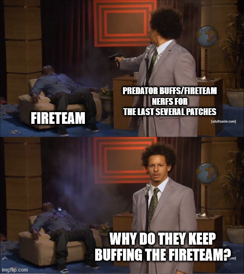 Anything else, because all I see are nerfs and changes that shouldn’t have needed to have been made in the first place (spotting finally addressed, reduced level of sound from Predator movement and when cloaked. These aren’t buffs, they were rectifying oversights) meanwhile Fireteam are treated like children, given actual buffs to damage output (like they needed anymore) as well as new weapons and kit which act as an even bigger crutch for weak gaming.